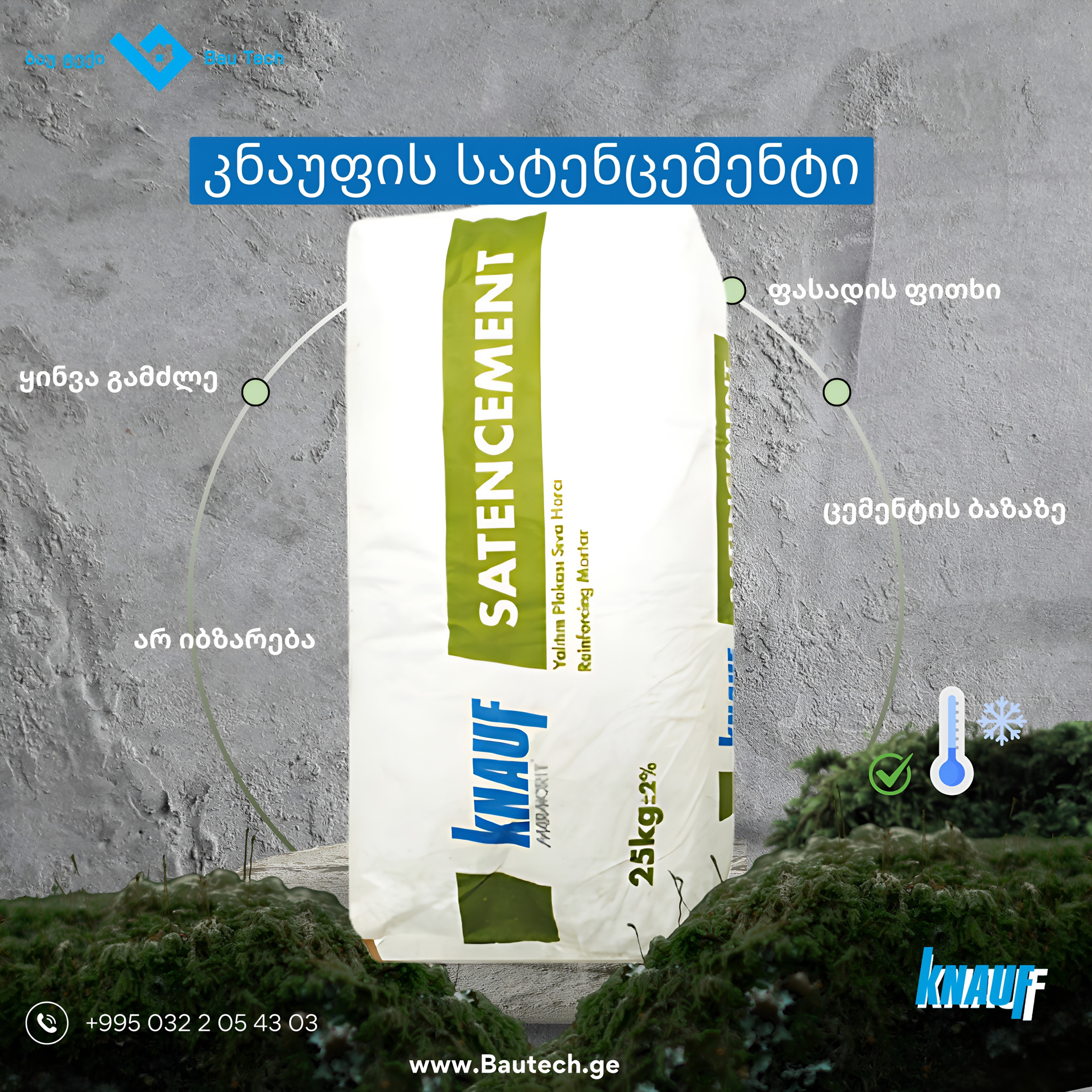კნაუფის უნივერსარული მაარმირებელი ბათქაში Satencement, გამოიყენება XPS, EPS და ქვაბამბის თბოიზოლაციის ფილების შესაწებებლად და საბოლოო ფენის მისაღებად ყველა სტრუქტურაში, შიდა და გარე გამოყენების, წყალგამძლე.